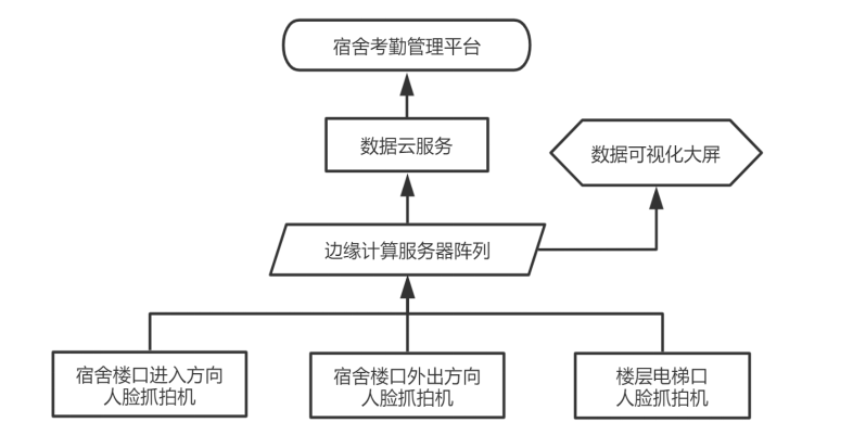 基于本校宿舍基本情況,結合學校運營管理模式,將宿舍考勤系統軟硬件模塊按照如下架構圖部署。綜合樓大門處出入兩方向根據樓道寬度分別安裝2-4個人臉識別抓拍機,6-11樓層電梯口各安裝2-3個人臉識別抓拍機,抓拍機視頻圖像數據通過網絡路由設備實時匯總*宿管邊緣計算服務器陣列,服務器將視頻流信息中解析出的人臉數據與校方學生人臉庫信息進行實時N比N快速驗證,獲得學生身份信息,將對比結果實時顯示在數據可視化大屏上。結合學校考勤及宿舍管理邏輯,將各維度報表分析推送*云服務器,校方管理人員可通過宿舍考勤管理平臺獲取數據分析結果。
